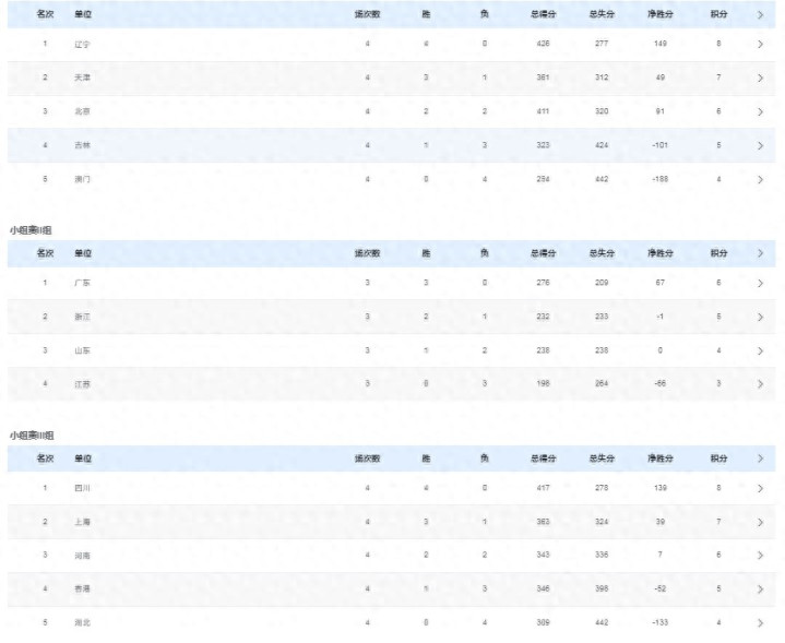 那么晋级八强的球队就是辽宁队、天津队、北京队;广东队、浙江队和山东队;以及四川队和上海队。按照规则,在八进四的比赛中,这八支球队会按照成绩分成四个小组,每个小组包括两支球队,然后通过抽签的方式进行对阵。说的简单一点,就是按照上面的方式算出各队的成绩和净胜分后,辽宁队和四川队的净胜分分别位居第一和第二,这两支球队会被分在E小组;广东队和辽宁队、四川队的战绩一样,但由于净胜分不如这两支球队,只能和成绩最好的小组第二上海队被分在F小组;浙江队和天津队被分在G组,北京队和山东队被分在H组。
